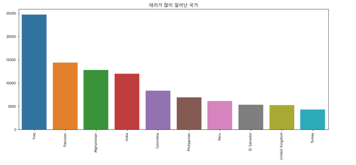 Step 2 : 전세계 테러 데이터를 가지고, 테러가 많이 일어난 국가를 정렬해 상위 10위의 국가를 시각화