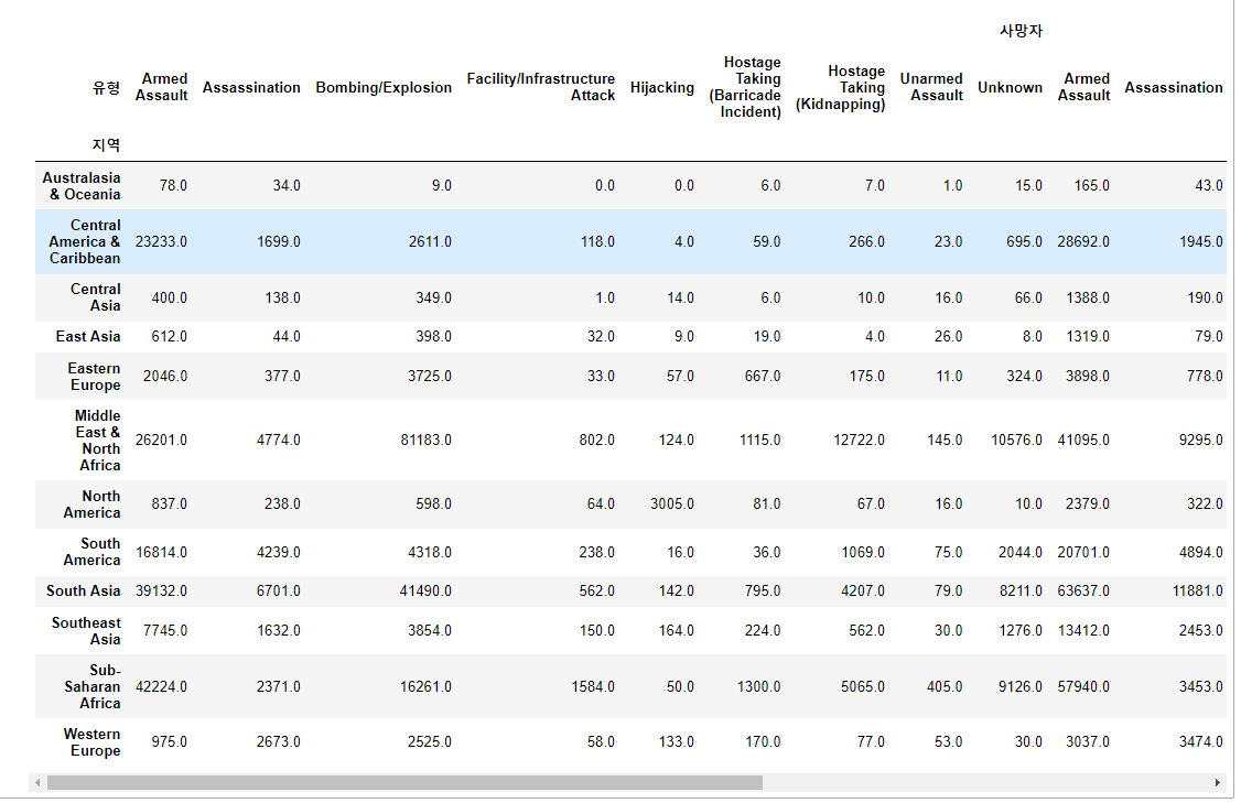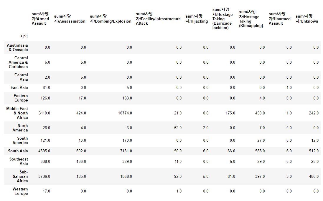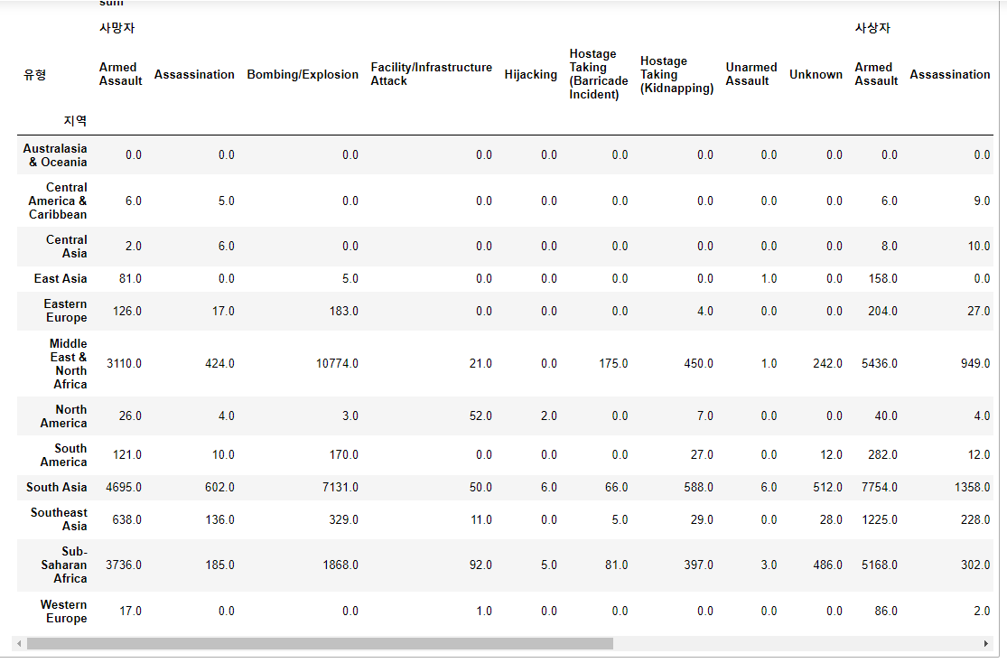 #피벗 테이블을 이용해 대륙별 테러유형에 따른 사망,사상자를 데이터프레임으로 나타냈다.