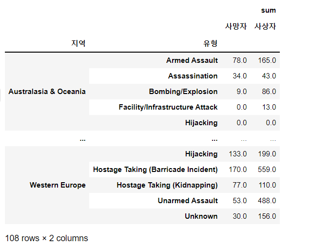 whathappen_2012_3 =Terror_World_step5.pivot_table(Terror_World_step5, index=["지역", "유형"], aggfunc = [np.sum] )