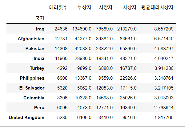 Terror_World_step3 = Terror_World_step3.pivot_table(Terror_World_step3, index=["국가"], aggfunc = [np.sum] )