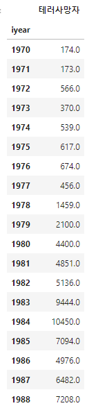 - step 1에서 필요한 자료를 먼저 생각해보자. 전체 기간에서 숫자를 연도별로 집계해야함으로 연도별 테러의 총합을 구해야할 것이라 생각된다,