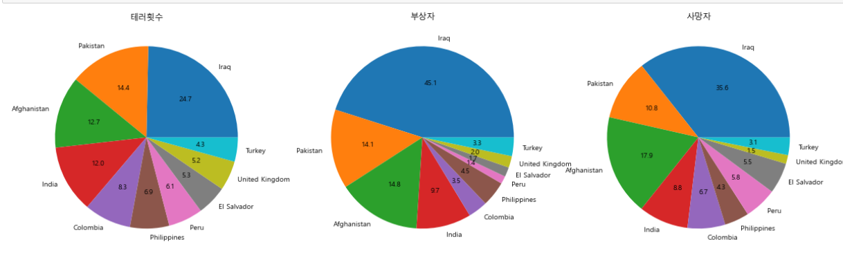 # 대한민국 범죄율 pdf에서 가져온 원 그래프를 그려 테러횟수, 부상자, 사망자를 보여준다.