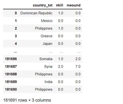 Terror_World_step3 = Terror_World.loc[:, ["country_txt", "nkill", "nwound" ]].fillna(0)