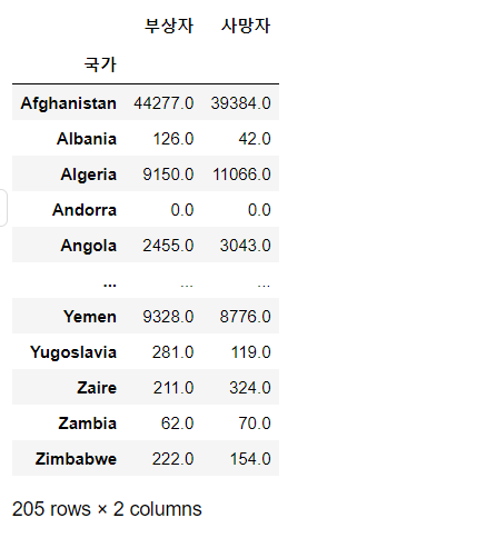 # 이 문제를 풀기위해 나라이름, 사망자, 부상자를 가져오자.