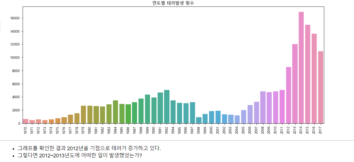 - 그래프를 확인한 결과 2012년을 기점으로 테러가 증가하고 있다.