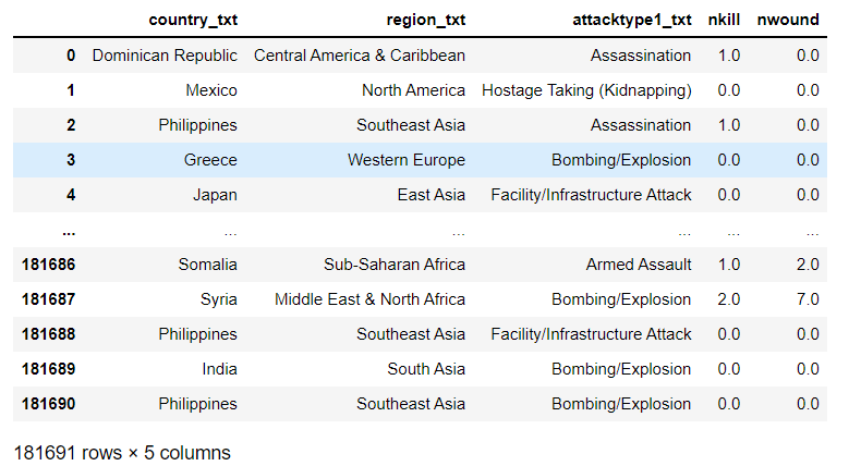 Terror_World_step5 = Terror_world2.loc[:, ["country_txt", "region_txt", "attacktype1_txt", "nkill", "nwound" ]].fillna(0)