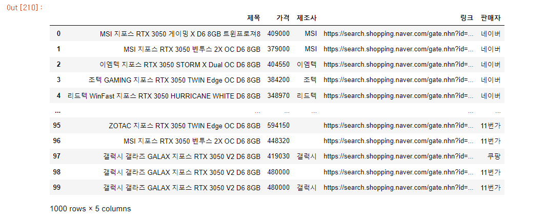 }, columns = ["제목", "가격", "링크", "판매자" ])
