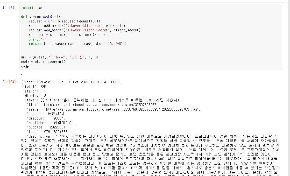 url과 ID, Secret을 통해서 관련 정보를 받아오는 코드입니다. -> 이는 네이버 API에 가면 예제를 함수로 만든 것이기 때문에 코드 설명은 생략하도록 하죠.