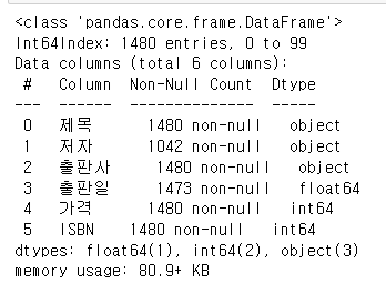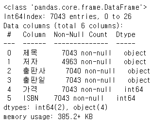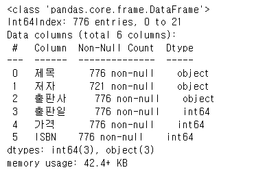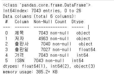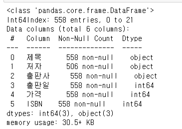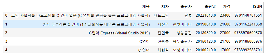 }, columns = ["제목", "저자", "출판사", "출판일", "가격", "ISBN" ])