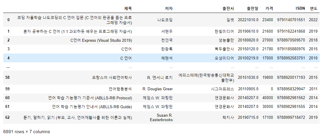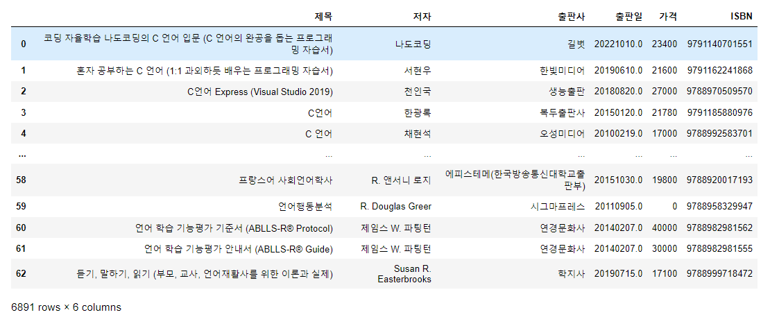 제목, 저자, 출판사, 출판일, 가격, ISBN을 데이터 프레임으로 저장해주는 함수입니다.