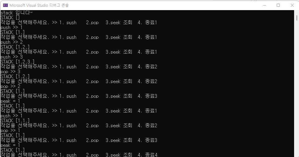 cout << "작업을 선택해주세요. >> 1. push 2.pop 3.peek 조회 4. 종료";