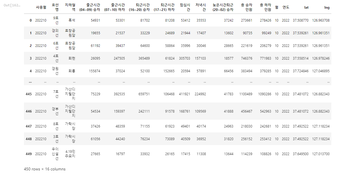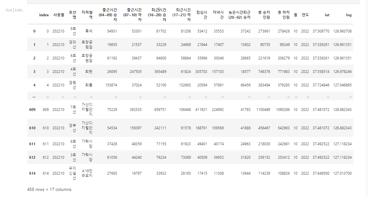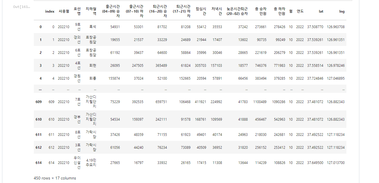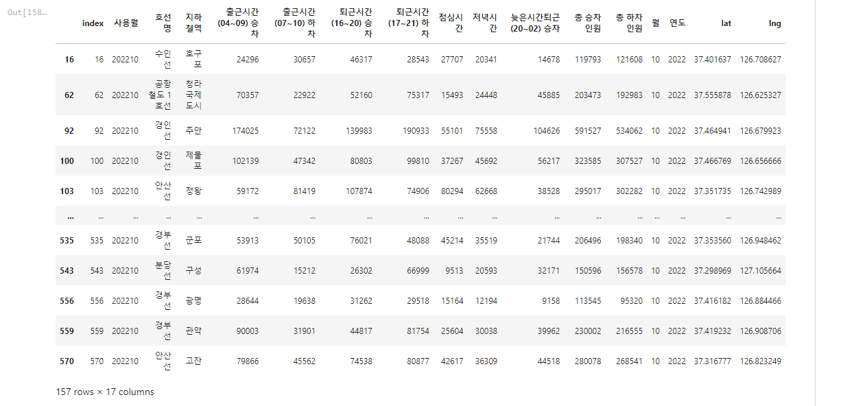 metro_2022_10_file =pd.merge(metro_2022_10, metro_location , left_on='지하철역', right_on='name', how='left')
