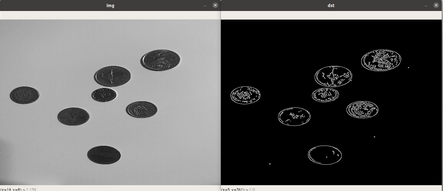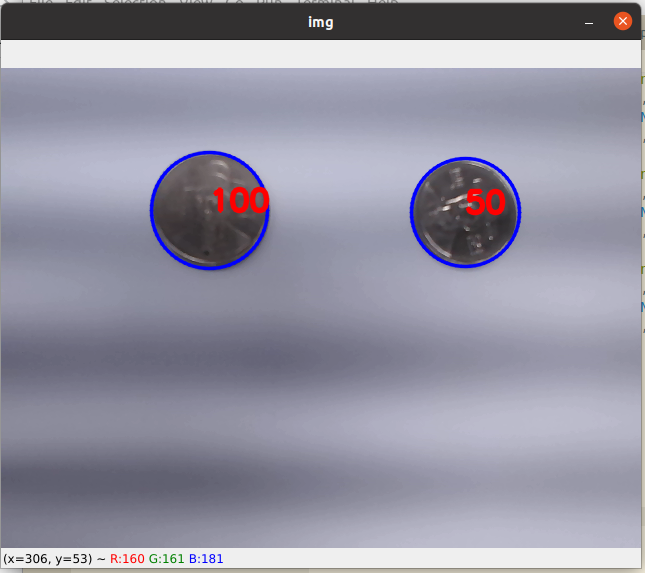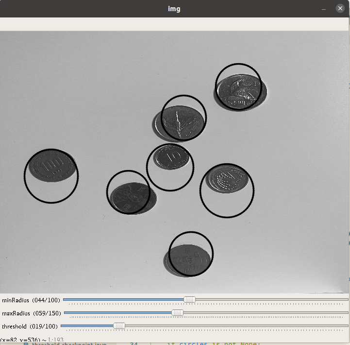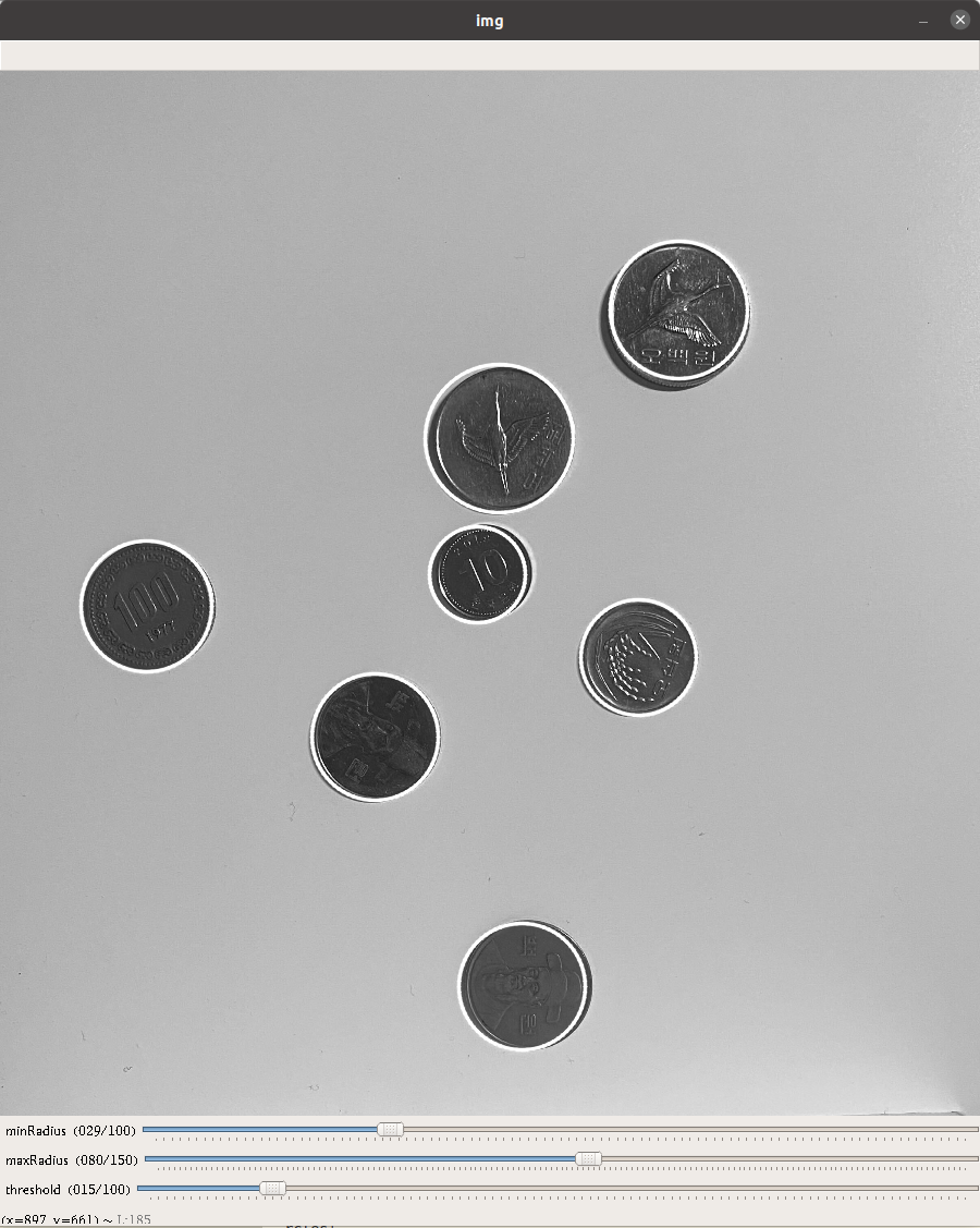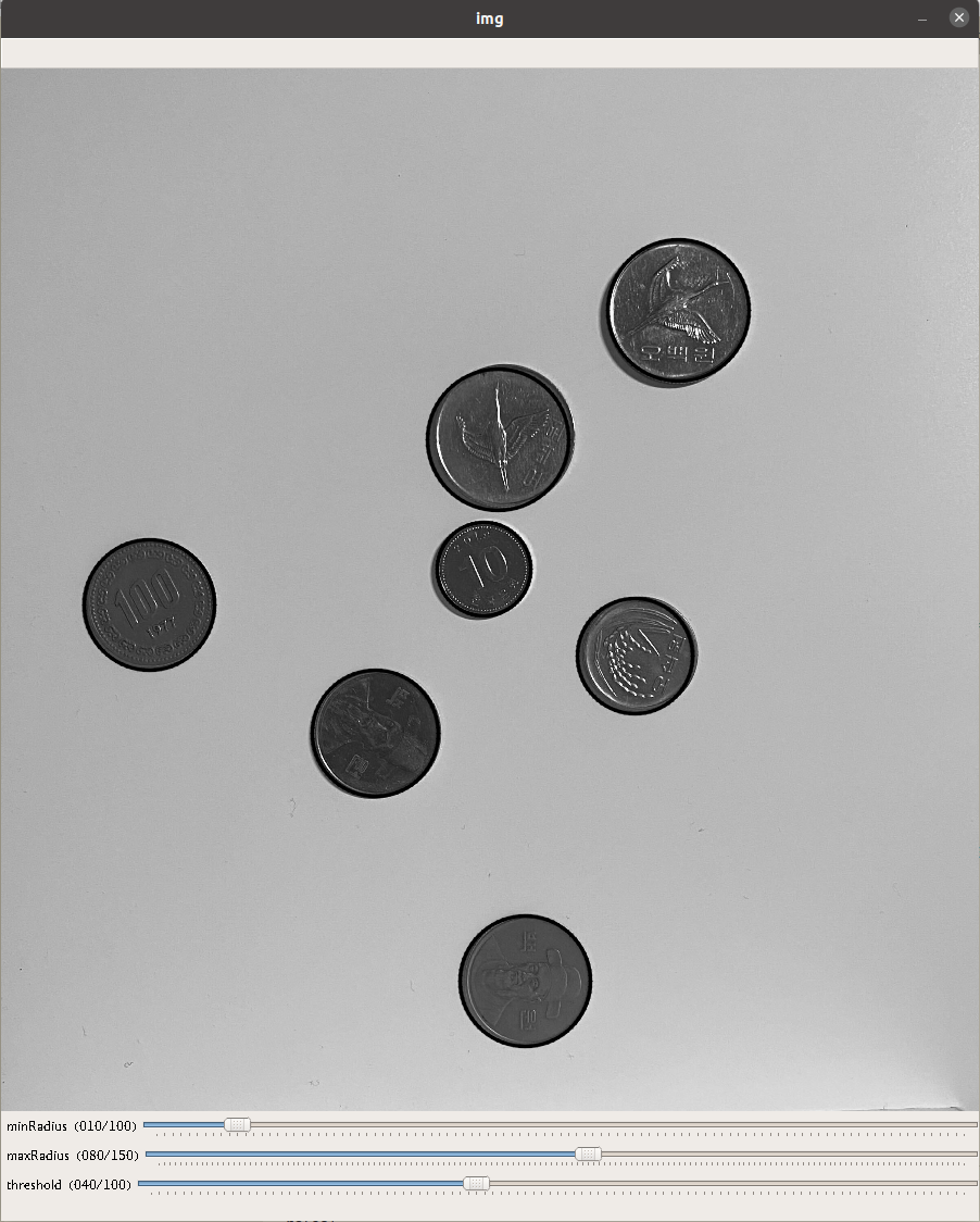 coin = cv2.HoughCircles(blr, cv2.HOUGH_GRADIENT, 1, 50, 150, 40, minRadius=20, maxRadius=80)