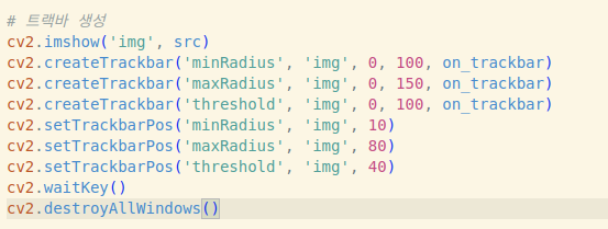일단 적절한 파라미터값을 찾았다면 setTrackbarPos를 수정하면된다.