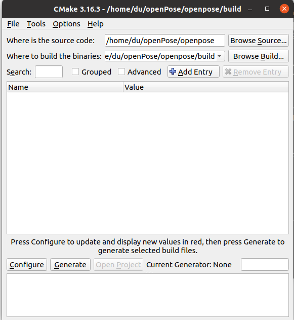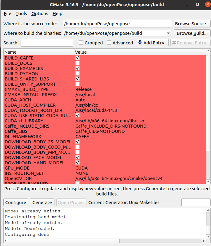 이제부터 본격적인 설치 1. installation openpose configuration openpose디렉토리에서 cmake-gui타이핑, openpose와 openpose/build를 경로로 설정. build파일이 없어도 그냥 경로를 넣어준다. 어차피 configure버튼 누르