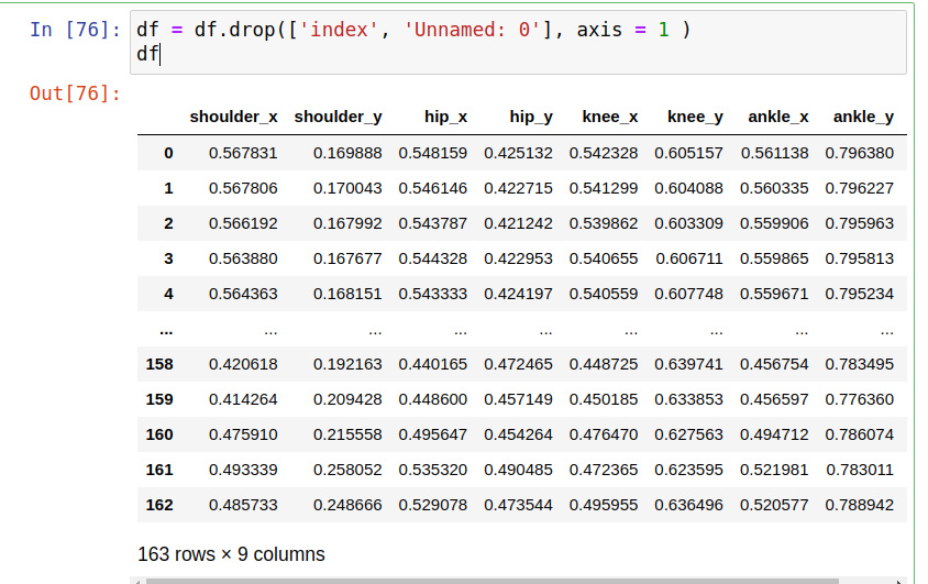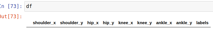 df.loc[len(df)] = [shoulder[0], shoulder[1], hip[0], hip[1], knee[0], knee[1], ankle[0], ankle[1], 0]
