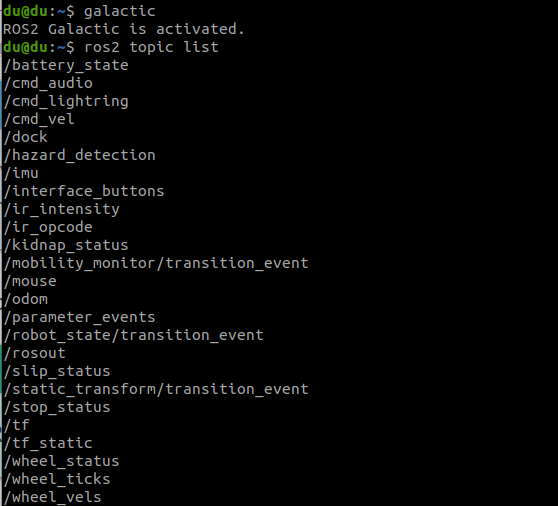 ros2 topic list를 했을때 다음처럼 ROS2 토픽이 보이면 create3는 설치가 완료된 것입니다.