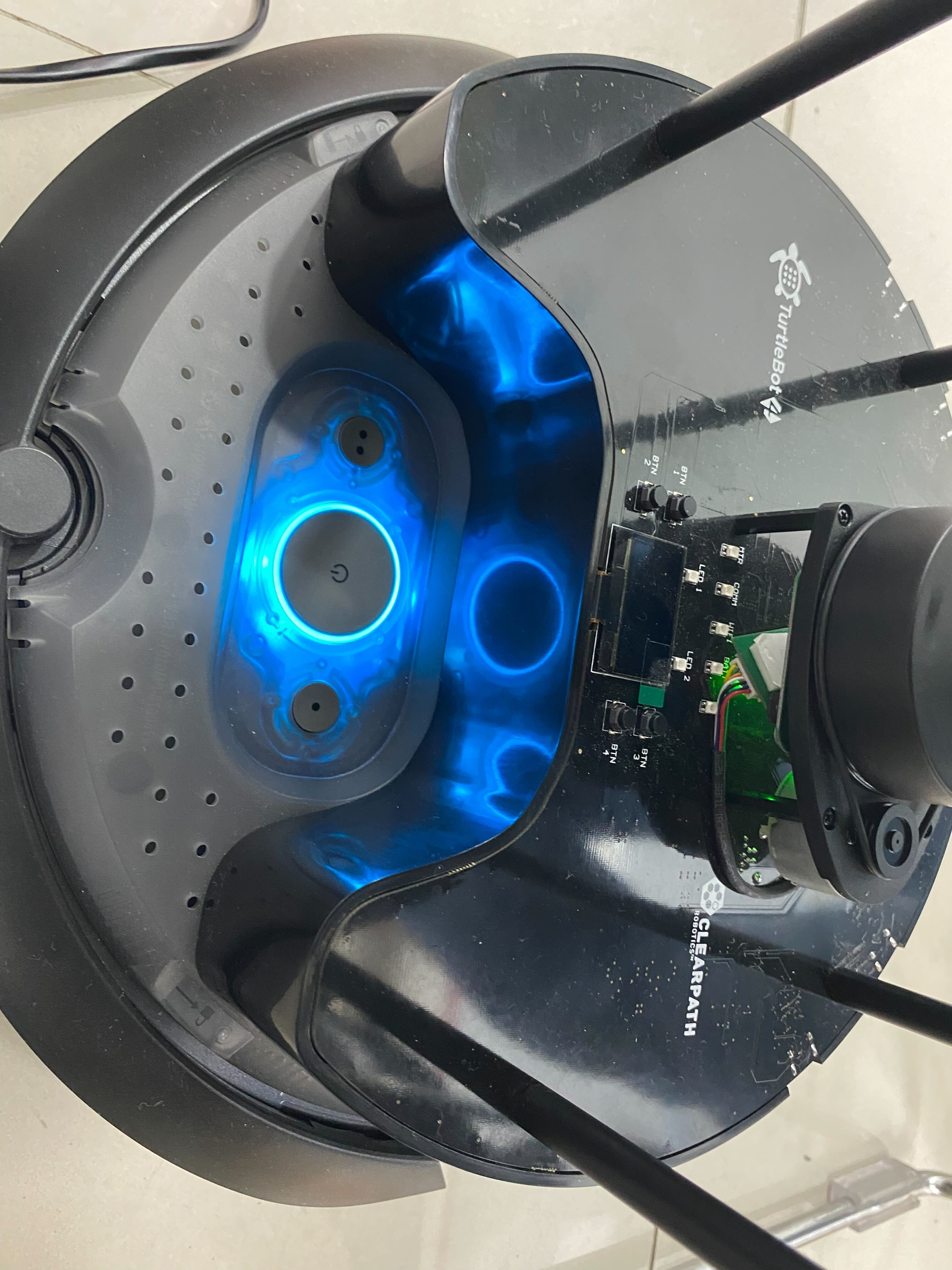 터틀봇의 전원버튼 양옆의 버튼 두개를 동시에 꾸욱 누르면 파란불이 들어옵니다.