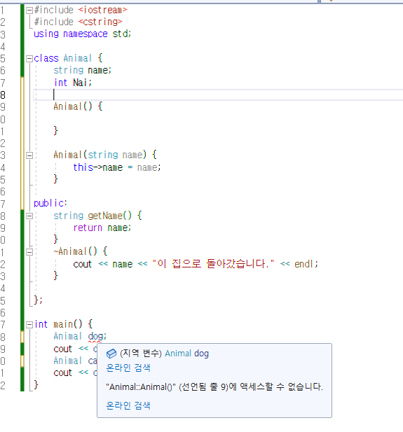바로 Animal()이라는 멤버함수입니다. 클래스의 이름과 같은 메소드가 컴파일러에 의해 자동으로 넣어져 실행되게 됩니다. 그래서 이를 생성자라고 부릅니다.