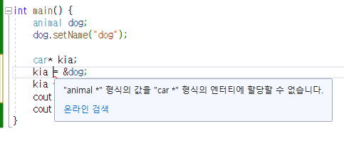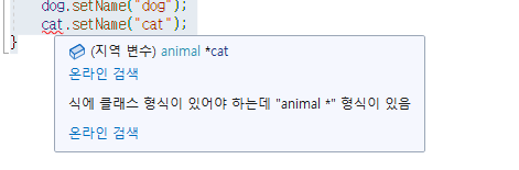 한 가지 궁금증이 생겼습니다. 지금은 animal* cat 인데, 배운 개념으로는 객체에 대한 포인터 선언이라고 하여 Animal의 포인터 변수를 선언한 것이였습니다.