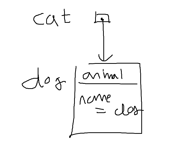 cat을 출력합니다. 그러면 dog 객체의 이름은 어떤 것을 가리킬까요?