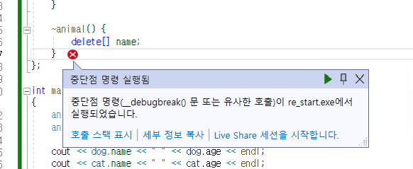다음과 같은 오류가 발생한다. 이는 이미 반환된 객체를 다시 반환하려고 하니 일어나는 문제이다. 왜 이런 일이 발생하는가? cat객체가 먼저 소멸된 후 name에 할당된 메모리를 반환하는데, dog의 name이 반환을 하러갈때 컴파일러가 "너 아까 반환했는데, 왜 또 반환해?" 하면서 오류가 발생하는 것이다.