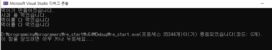 cout << "먹이를 다 먹었습니다" << endl;