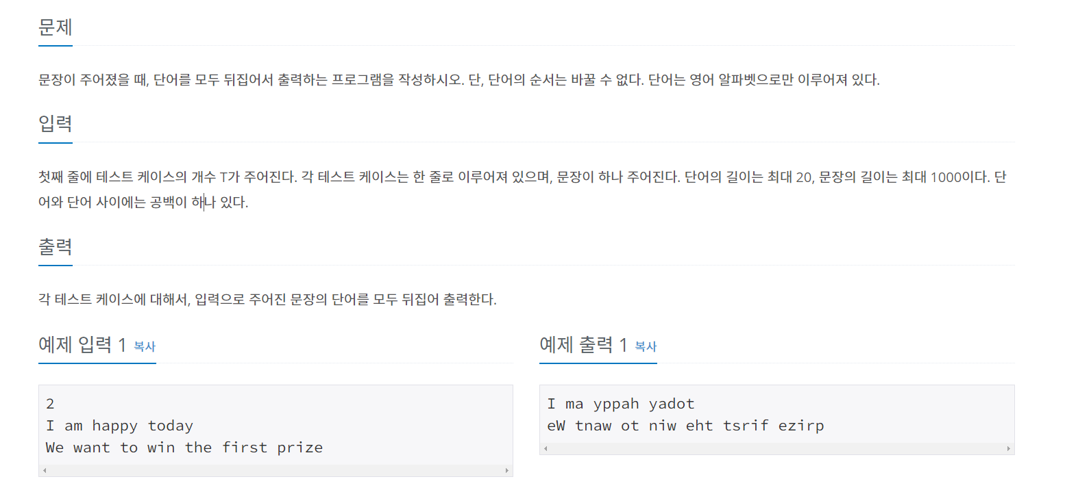 이 코드는 입력으로 들어오는 문자열을 단어 단위로 뒤집어서 출력하는 문제를 해결하기 위한 코드입니다.