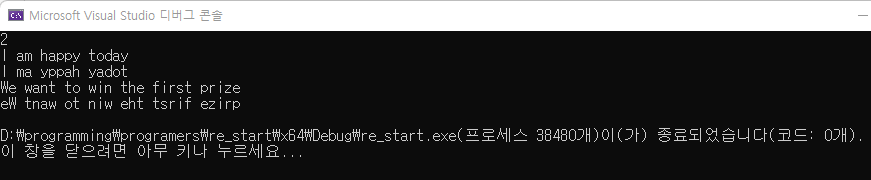 첫째 줄에 테스트 케이스의 개수 T가 주어진다. 각 테스트 케이스는 한 줄로 이루어져 있으며, 문장이 하나 주어진다. 단어의 길이는 최대 20, 문장의 길이는 최대 1000이다. 단어와 단어 사이에는