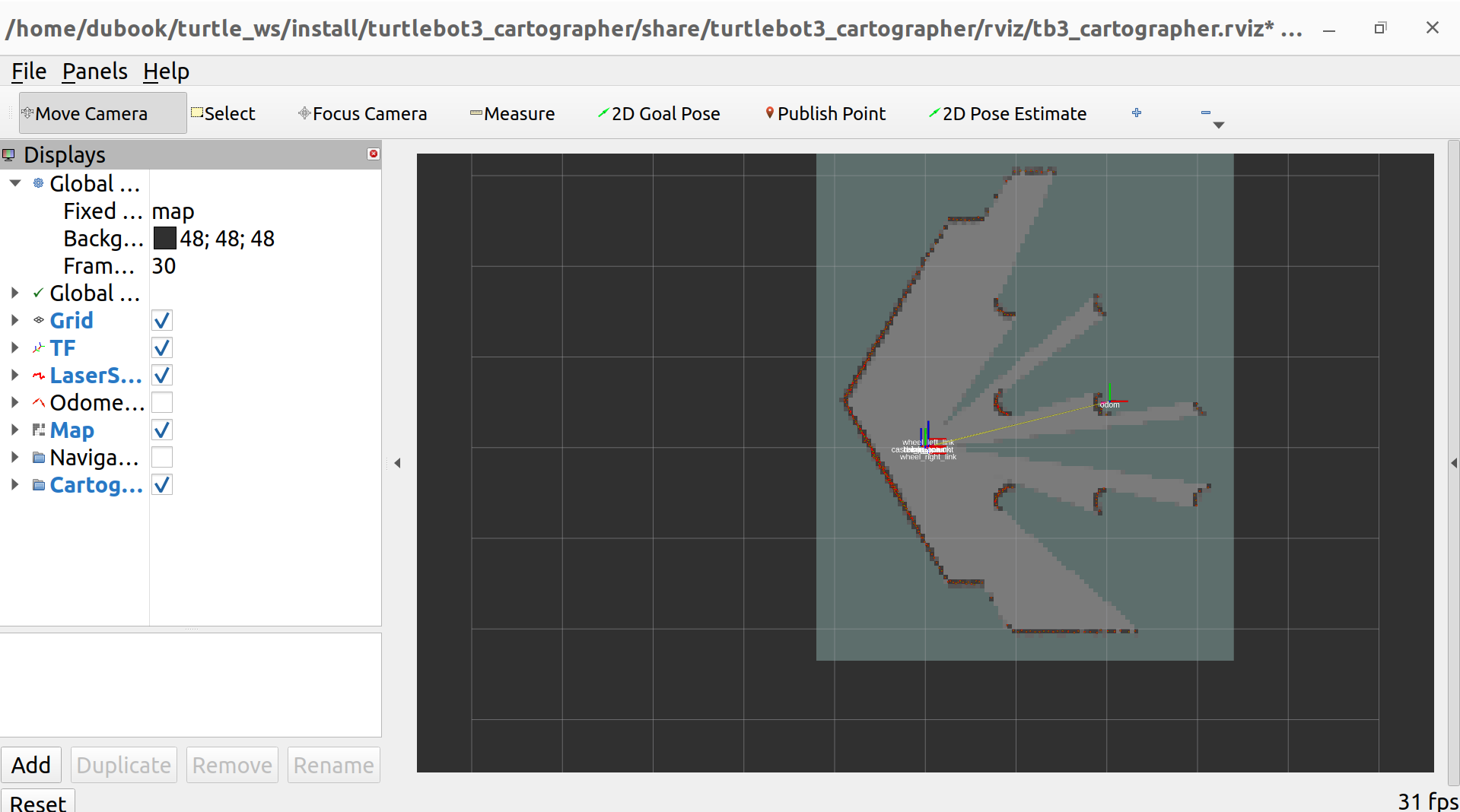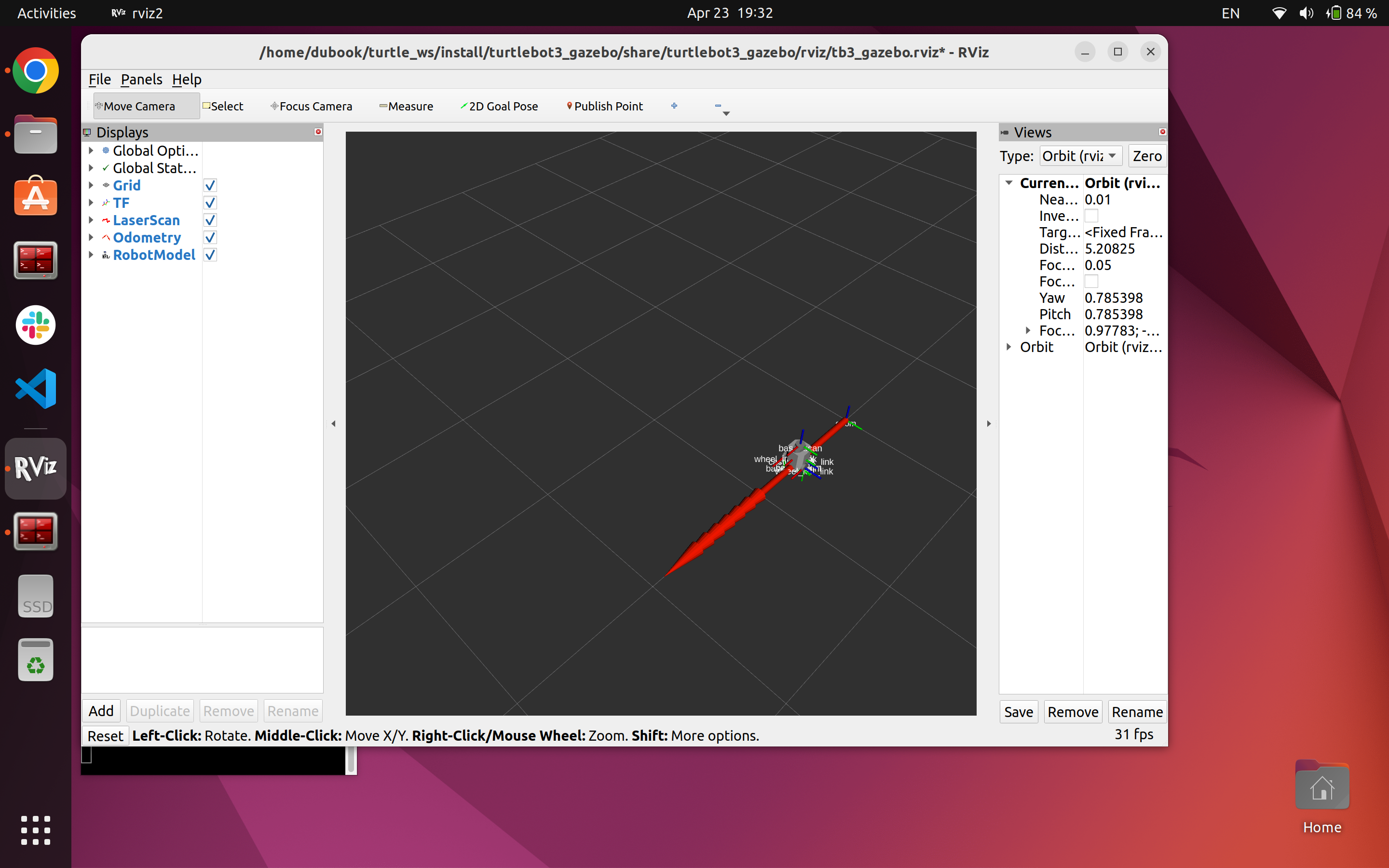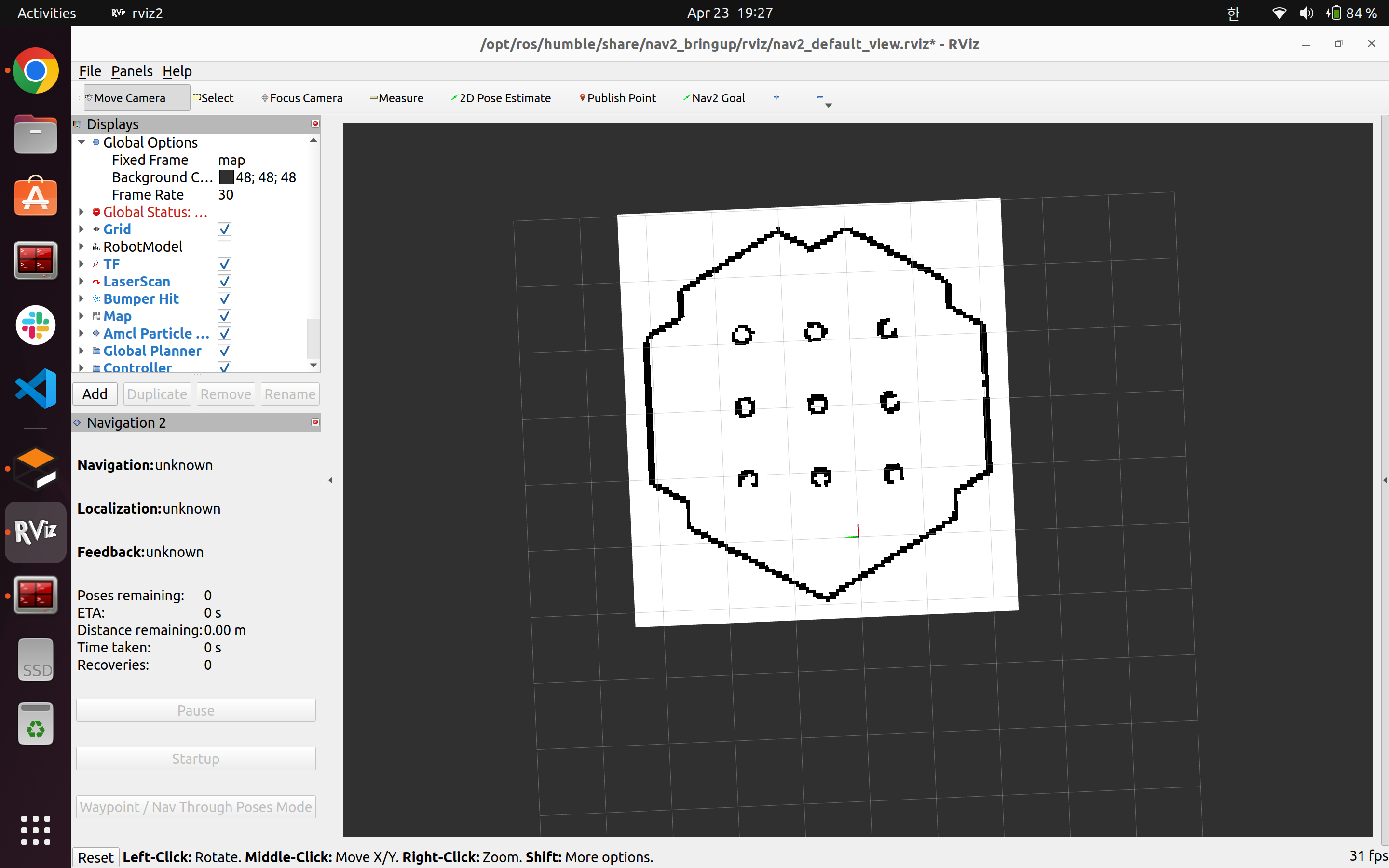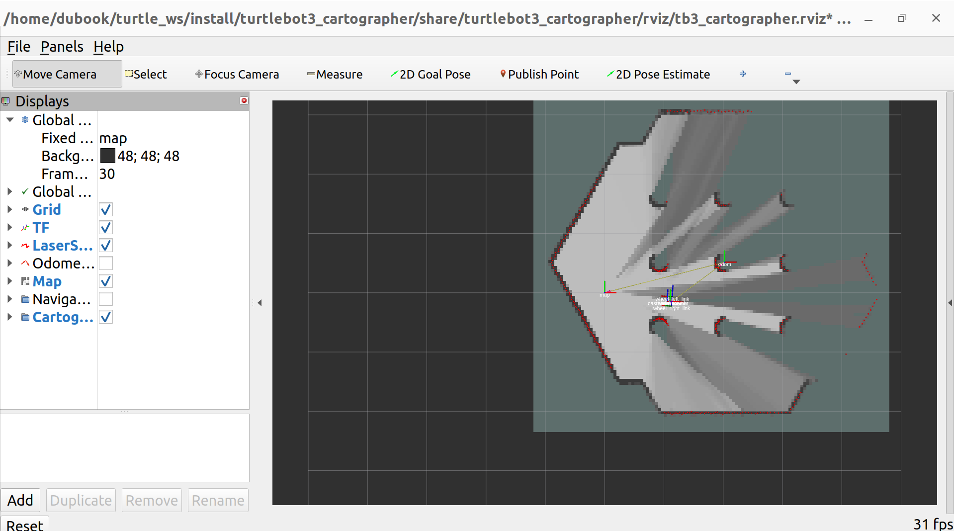 rviz가 이런식으로 뜨면 성공입니다. SLAM용으로 이 프로그램은 처음 써보네요.