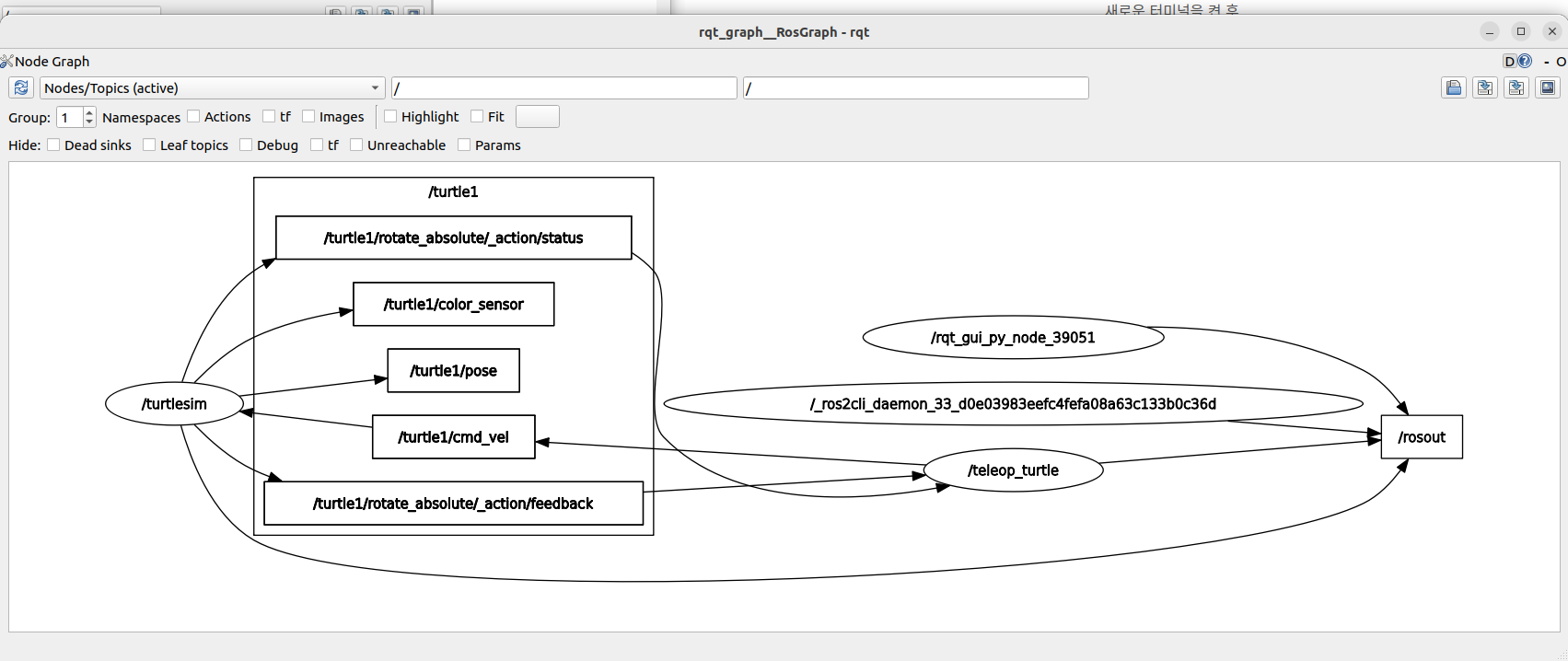 놀고있는터미널에서 다음을 입력하고 rqt_graph를 확인해봅니다.