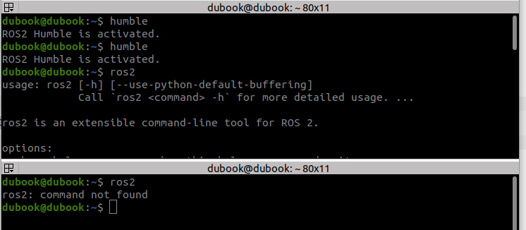 다음의 명령어를 터미널에 입력해서 환경을 불러올 수 있지만, 위에서 언급한대로 ./bashrc에 등록을 하는 경우에는 humble만 입력을 해주어도 됩니다.