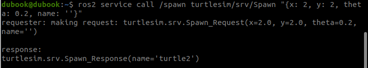 ros2 service call /spawn turtlesim/srv/Spawn "{x: 2, y: 2, theta: 0.2, name: ''}"