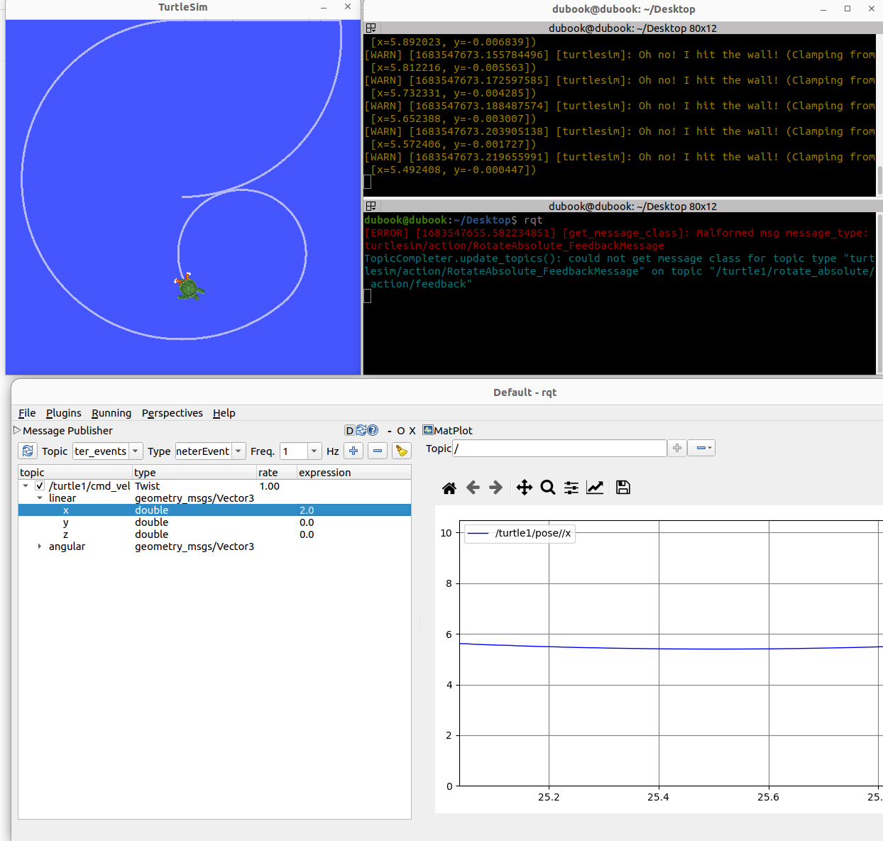 또한 message를 직접 발행할 수 있습니다. 모든 명령어를 종료하고 turtlesim_node와 rqt만 실행해서 토픽을 직접 발행해봅시다.