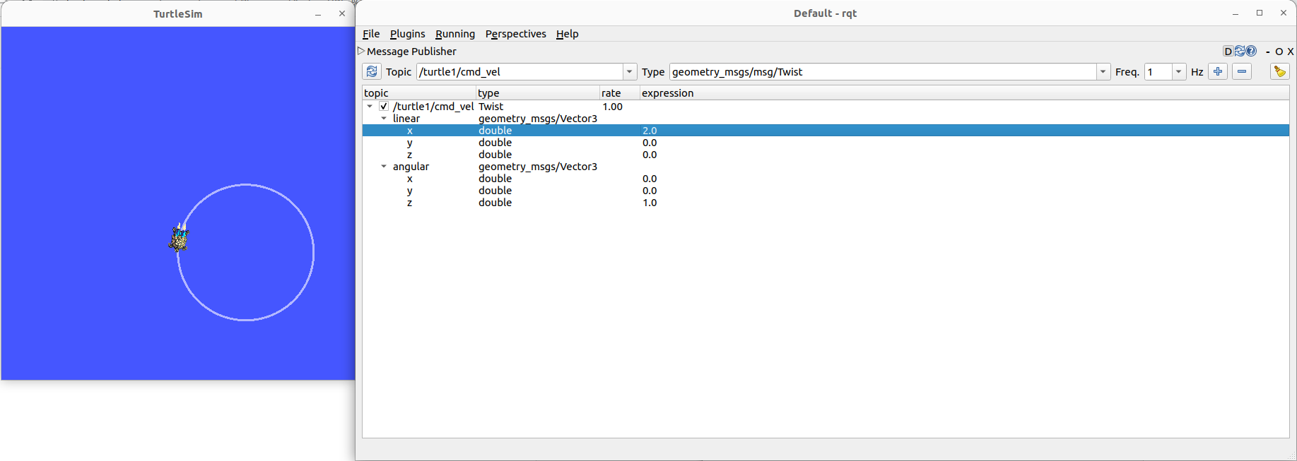 turtlesim이 cmd_vel topic을 정상적으로 구독하고 움직이기 시작합니다. 다음처럼하면 원을 그리면서 움직입니다.