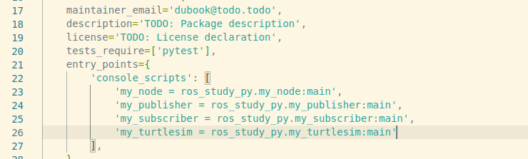 rclpy.shutdown()위에서 설명한 것과 동일합니다. rclpy를 초기화하고, node를 실행합니다. 그래서 위의 코드를 my_subscriber.py로 만들고 setup.py를 수정하면 다음과 같습니다.