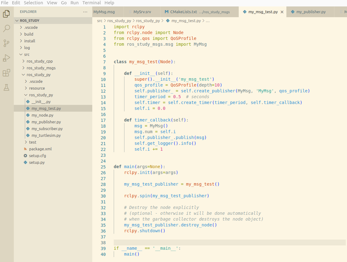 다음처럼 MyMsg파일을 가져오게 합니다. 이후에 노드 부분을 수정합시다. 우리가 만들고자 하는 목표는 0.5초마다 우리 메시지 타입으로 발행하는 코드 작성입니다.