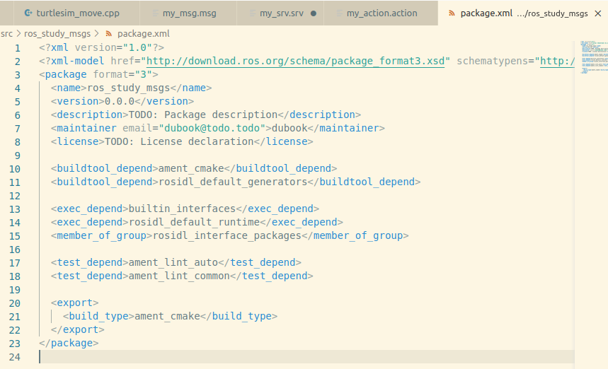 이렇게 인터페이스 관련 패키지를 만들게 되었습니다. 그러면 package.xml과 CMakeLists.txt 파일을 변경해주어야합니다.