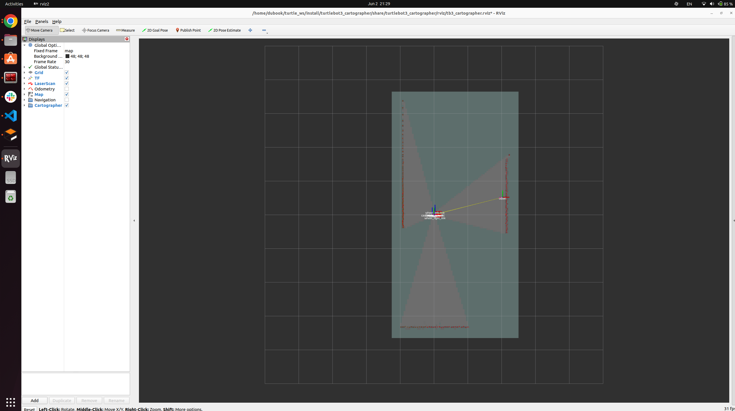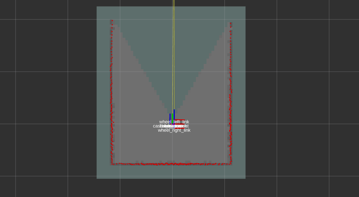 여튼 다시 돌아와서 Rviz에서 보면 빨간색점으로 표시된 부분이 라이다의 입력값들입니다. 벽에 부딪히고 다시 돌아와서 저 지점에 뭔가가 있어 라고 온 것이죠.. 여튼 SLAM을 계속 진행합시다.