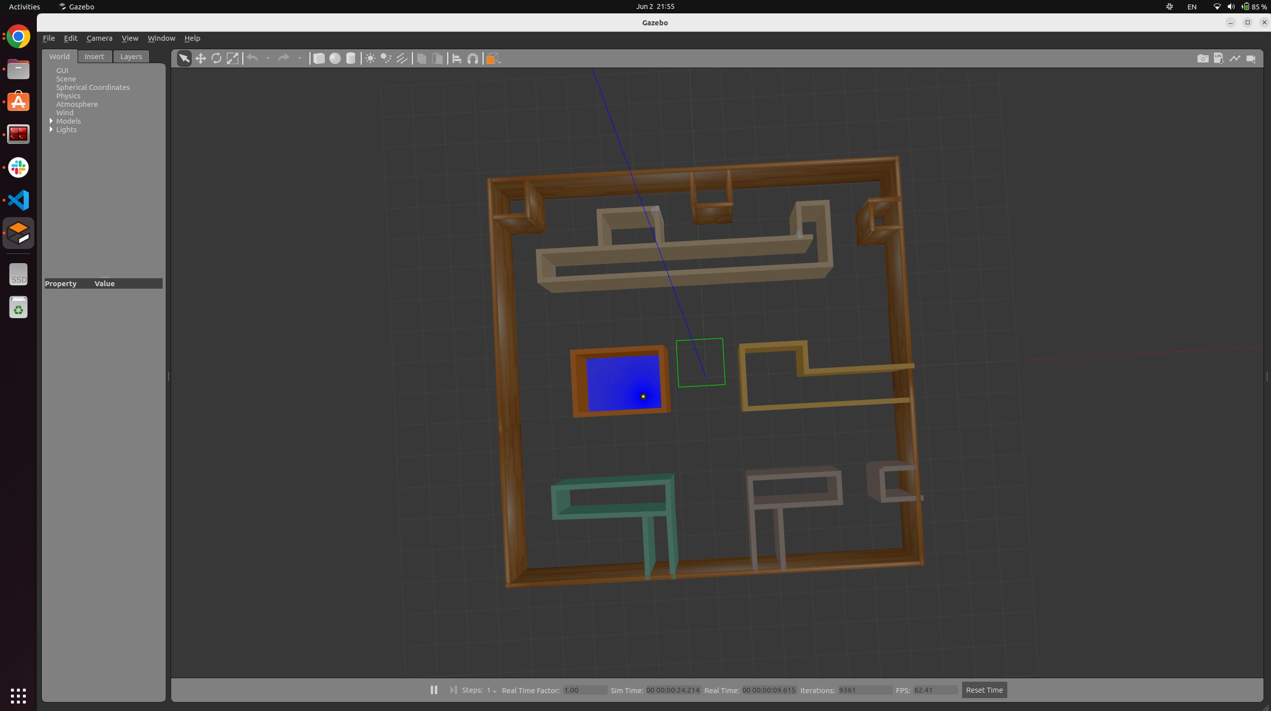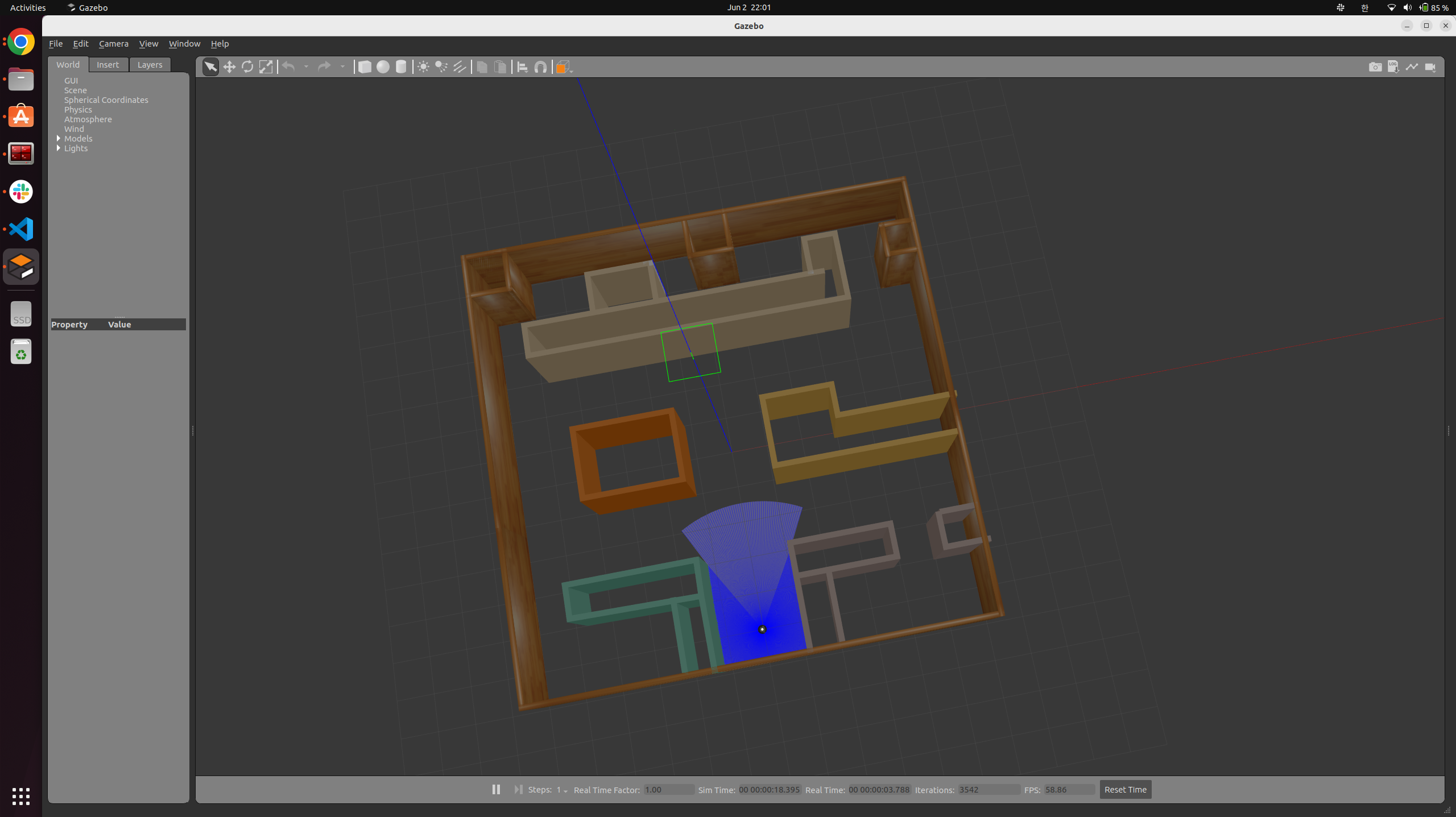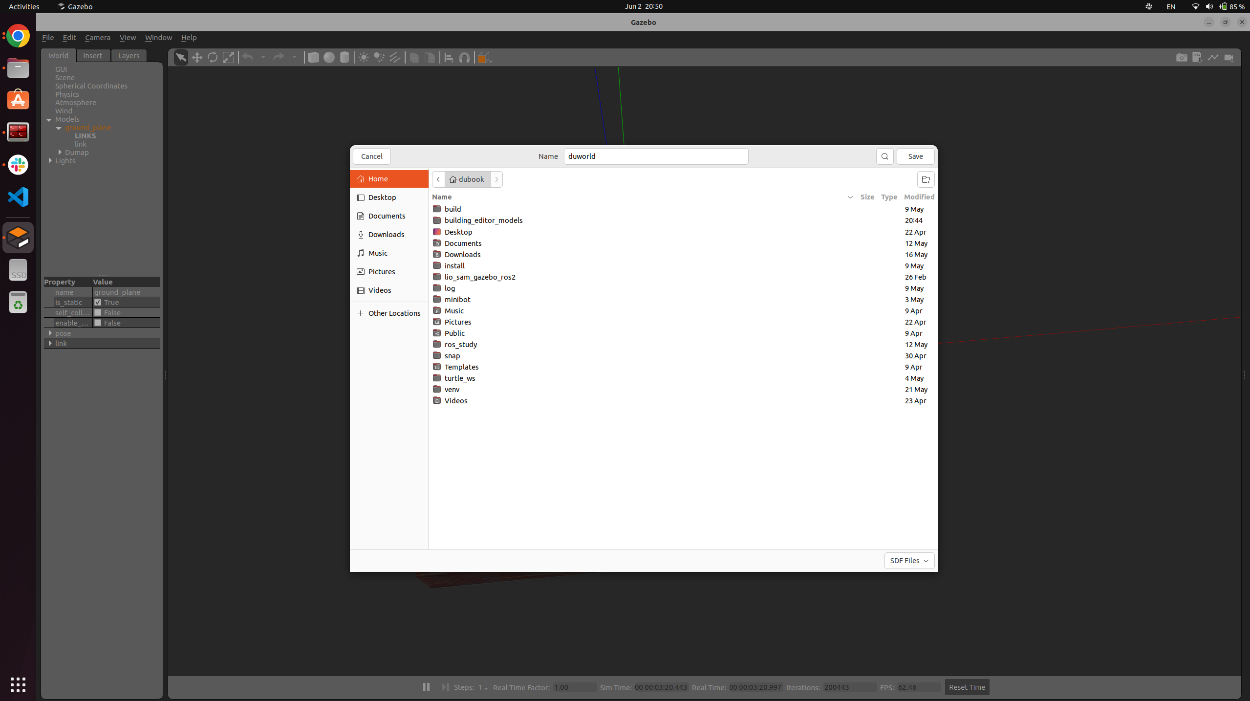 gazebo에 다음처럼 map이 보일 것입니다. 여기서 다시 저장하면 world파일이 만들어집니다. 이 파일을 사용해야합니다. 왼쪽 위에 파일에서 world를 저장합니다. 꼭 확장자명을 .world로 만들어주어야합니다.