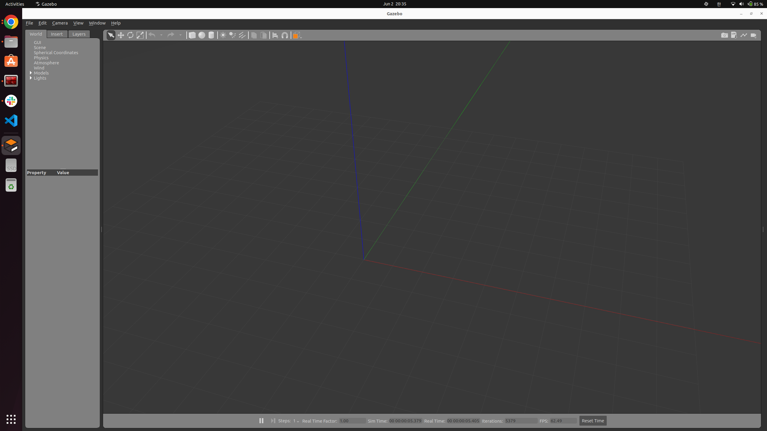 gazebo를 입력하면 다음처럼 시뮬레이터가 실행될 것입니다.