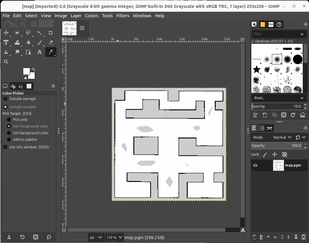 그러면 다음과 같은 맵파일이 만들어집니다만.. 이걸 가지고 로봇을 움직이는데에는 문제없으나, cartographer는 저렇게 애매한 부분을 남기는 군요.. 흰부분이 살짝 문제가 될 수도 있습니다. 그러니 이걸 지우고 갑시다.