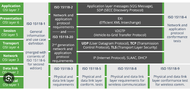 간단하게 설명하자면 전기차와 충전 인프라간의 통신 프로토콜을 정의한 표준입니다. 여기서 네트워크에 대한 지식을 요하게 되며, 각 네트워크 7계층에 대한 세부 표준이 정의되어 있습니다.