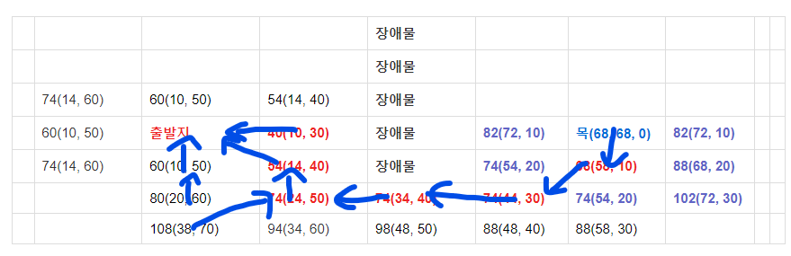 | 74(14, 60) | 60(10, 50) | 54(14, 40) | 장애물 | 74(54, 20) | 68(58, 10) | 88(68, 20) | |||