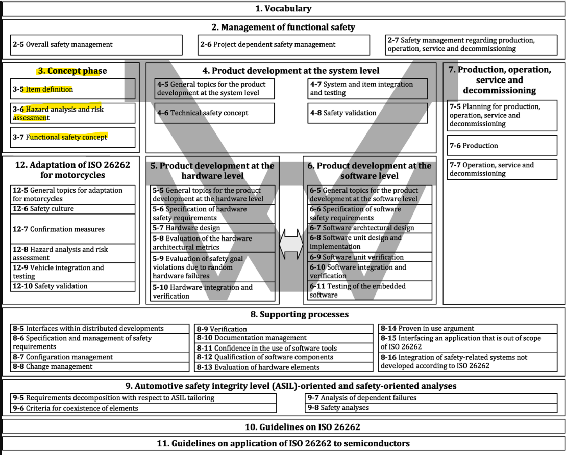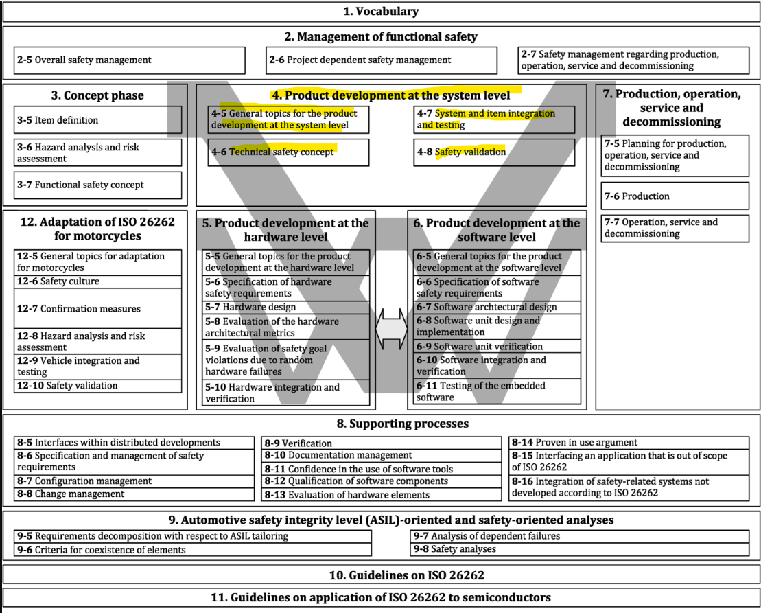 ISO26262에서도 동일하게 전장품 개발에대한 내용을 Chapter 별로 구분해서 정리를 해놓았습니다.
