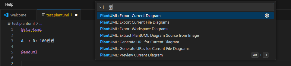 ctrl + shift + p를 누르고 plantuml을 검색합니다.