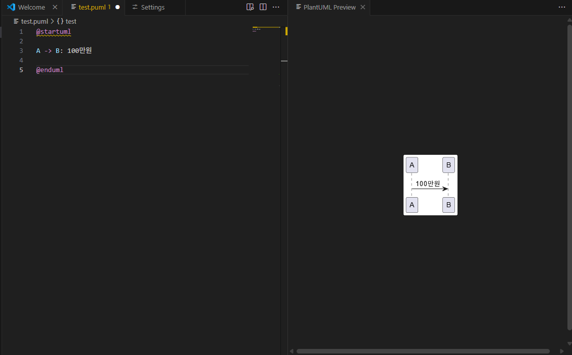 plantuml의 장점은 코드를 작성함과 동시에 미리보기도 지원이됩니다.