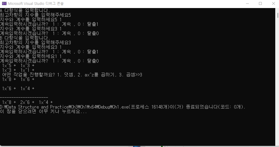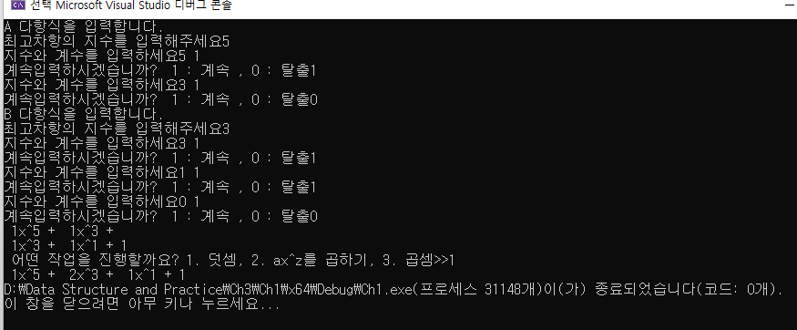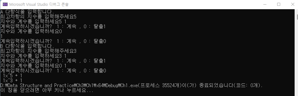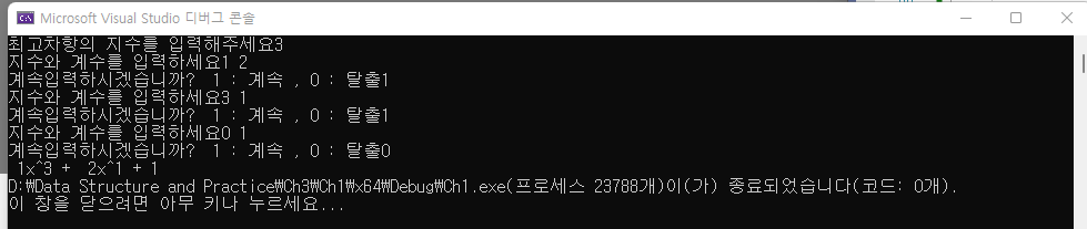 2. 계수와 지수를 입력받고, 최고차항부터 입력을 받아 최고차항으로 동적배열을 생성하고 반복문과 if문을 통해 저장하는 방법 (exit를 통해 무한루프를 탈출)