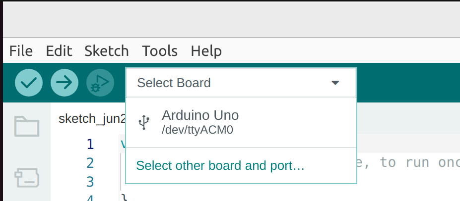 여기서 다음처럼 Select Board로 Arduino Uno가 나올 것입니다. 여기서 Arduino Uno를 선택합니다.